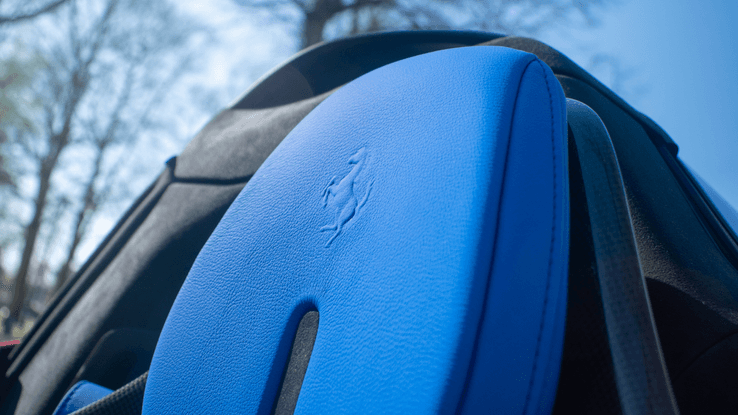 Inside, the car features Azzurro Santorini special leather upholstery, carbon fibre racing seats and Alcantara® piping in Nera 9441. The cabin is finished with a carbon dashboard, matte carbon lower zone, Ferrari logo floor mats and a dedication silver plate. A fire extinguisher and manual seat height adjustment underscore its track-ready focus.