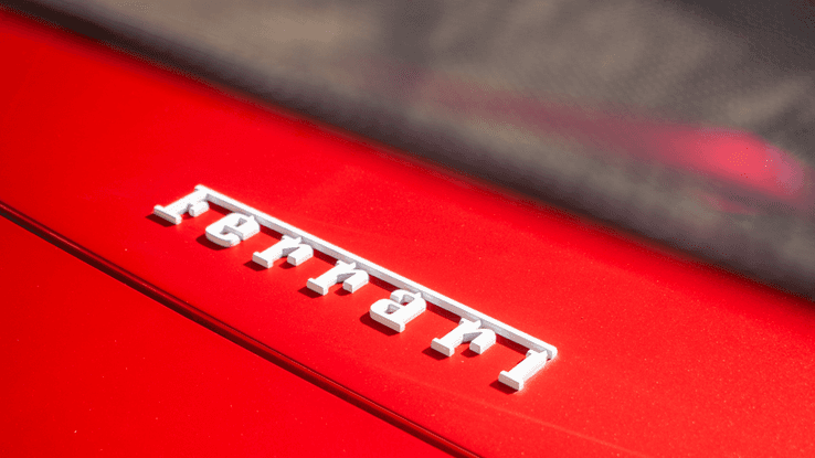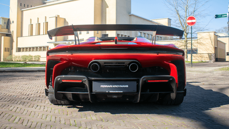 This specific SF90 XX Spider is finished in Rosso Magma with striking racing number 77 decals. The exterior is fitted with glossy carbon fibre components, including the engine air intakes, rear spoiler, diffuser, side skirts and front splitter. Black ceramic-coated tailpipes, black brake calipers and Scuderia Ferrari fender shields further enhance its track-inspired aesthetic.