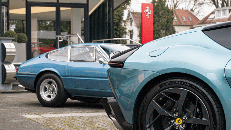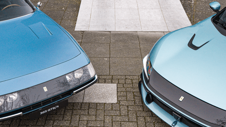 In deze blauwe uitvoering komen beide modellen nóg chiquer voor de dag. Het blauw geeft ze een stijlvolle, ingetogen klasse die perfect past bij het brullende V12-blok onder de motorkap. Het is niet vaak dat je twee generaties Ferrari's naast elkaar ziet, elk met hun eigen karakter maar toch onmiskenbaar afkomstig uit dezelfde bloedlijn.