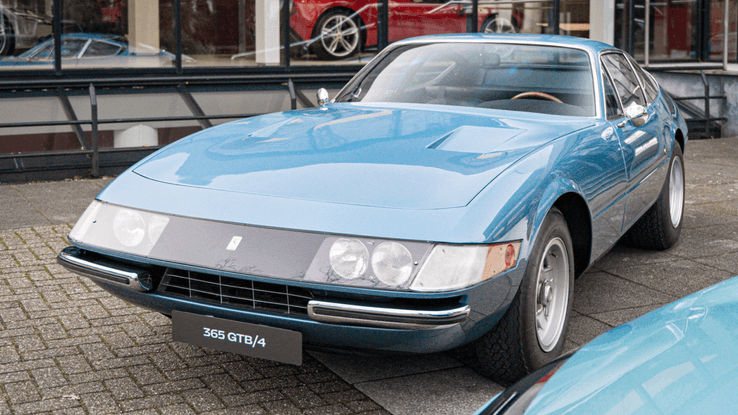 Daartegenover staat de iconische Ferrari 365 GTB/4, ook bekend als de ‘Daytona’. Dit exemplaar is extra bijzonder: het gaat om een zeldzame versie met plexiglazen neus. Zijn lage, lange carrosserie en glanzende chromen accenten geven 'm een elegante, maar krachtige uitstraling. De plexiglazen voorkant, waarin de koplampen zijn geïntegreerd, maakt het ontwerp helemaal af en geeft de auto een herkenbaar en tijdloos gezicht. Een knipoog naar het verleden die je ook terugziet in de 12Cilindri.